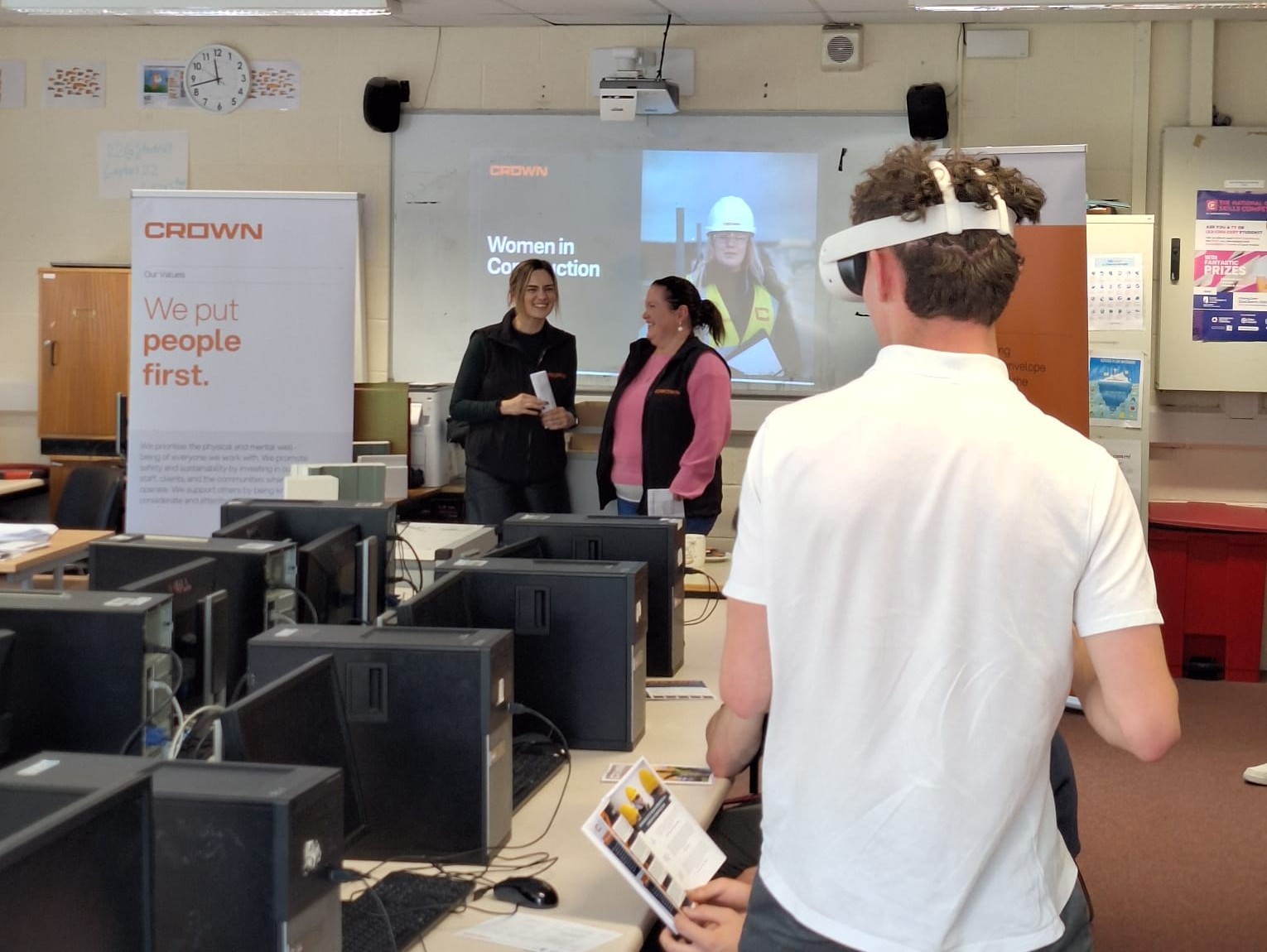 Crown colleagues discussed their diverse roles and the exciting career opportunities in the construction sector. The students also had the chance to try out our new virtual reality (VR) goggles, and walk through one of our projects, demonstrating the ever-increasing intersection of construction and technology.